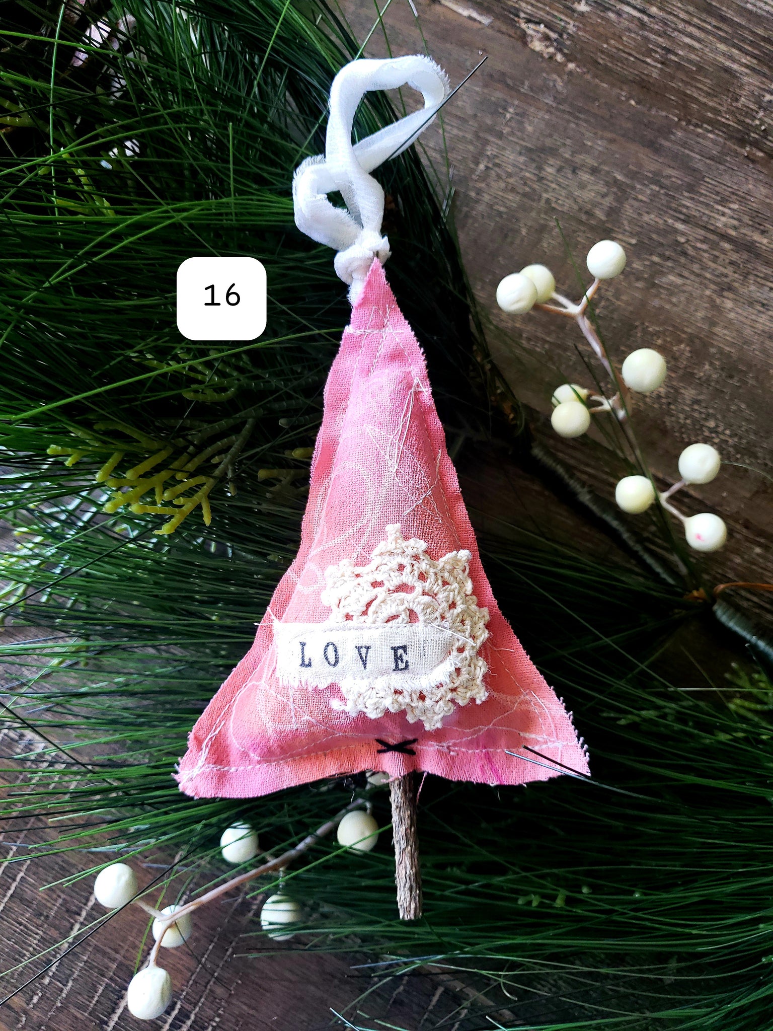 My signature marks, botanicals and words are found throughout the fabric. Each ornament has winter white or berry magenta sari ribbon for hanging.  You will find vintage doilies, cheesecloth, sari ribbon or fabric pieces added to the ornaments. Each tree has a hand stamped inspirational word sewn on the front. Free motion stitching and hand stitching are added to each ornament. A foraged tree branch has been added for the tree trunk. All of this adds to the hand made charm of each unique, one-of-a-kind ornament. Perfectly imperfect.