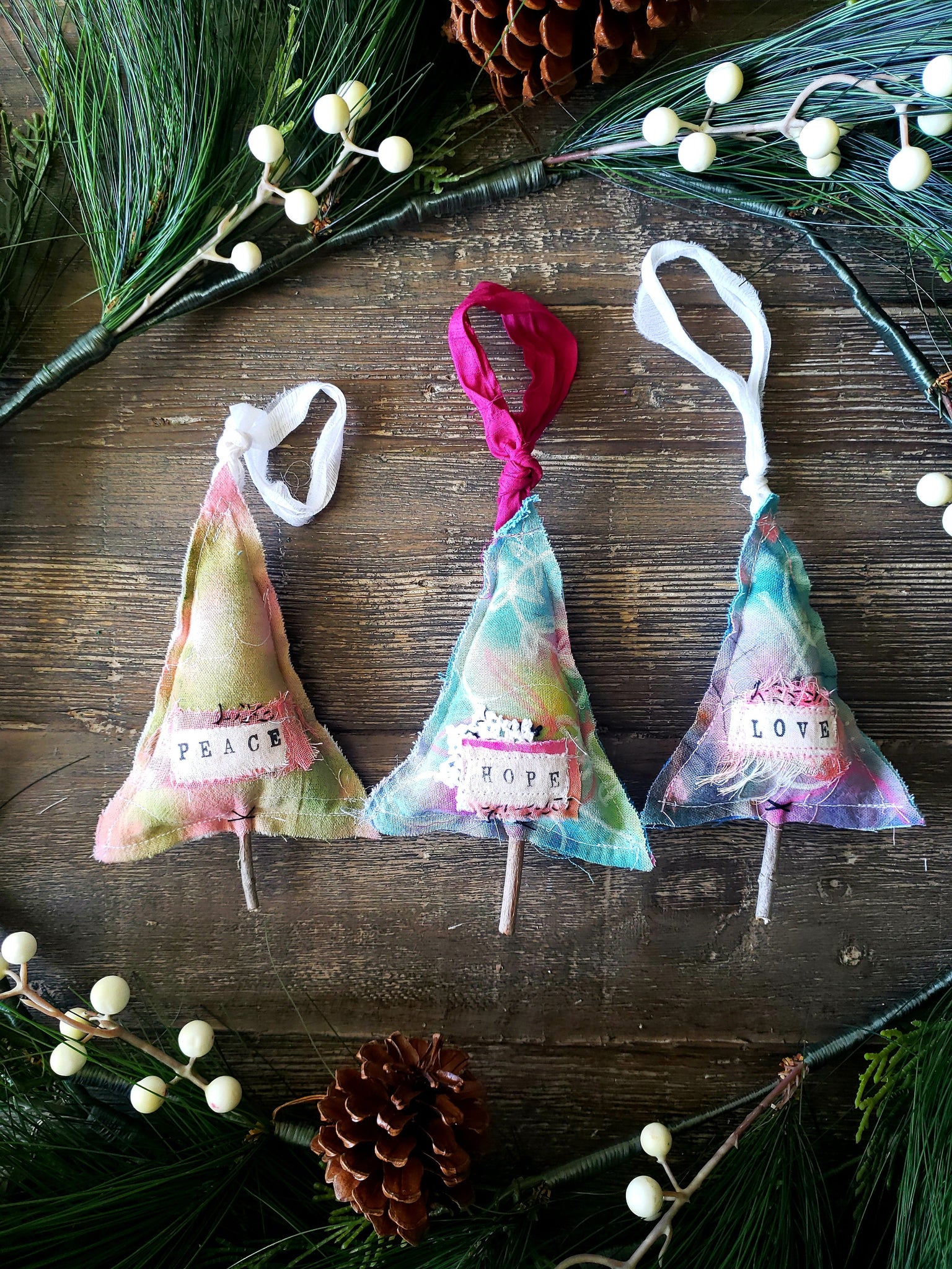 My signature marks, botanicals and words are found throughout the fabric. Each ornament has winter white or berry magenta sari ribbon for hanging.  You will find vintage doilies, cheesecloth, sari ribbon or fabric pieces added to the ornaments. Each tree has a hand stamped inspirational word sewn on the front. Free motion stitching and hand stitching are added to each ornament. A foraged tree branch has been added for the tree trunk. All of this adds to the hand made charm of each unique, one-of-a-kind ornament. Perfectly imperfect.